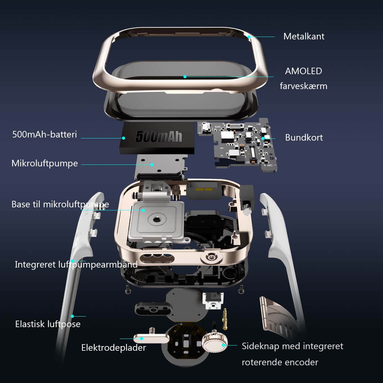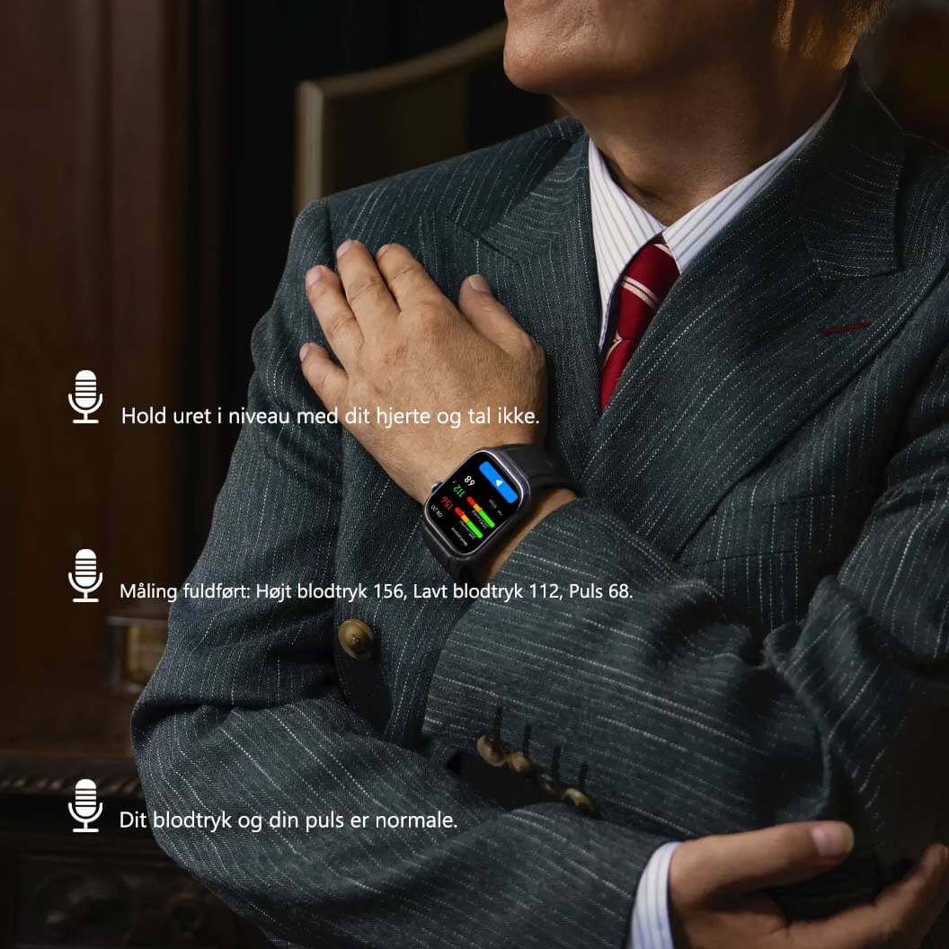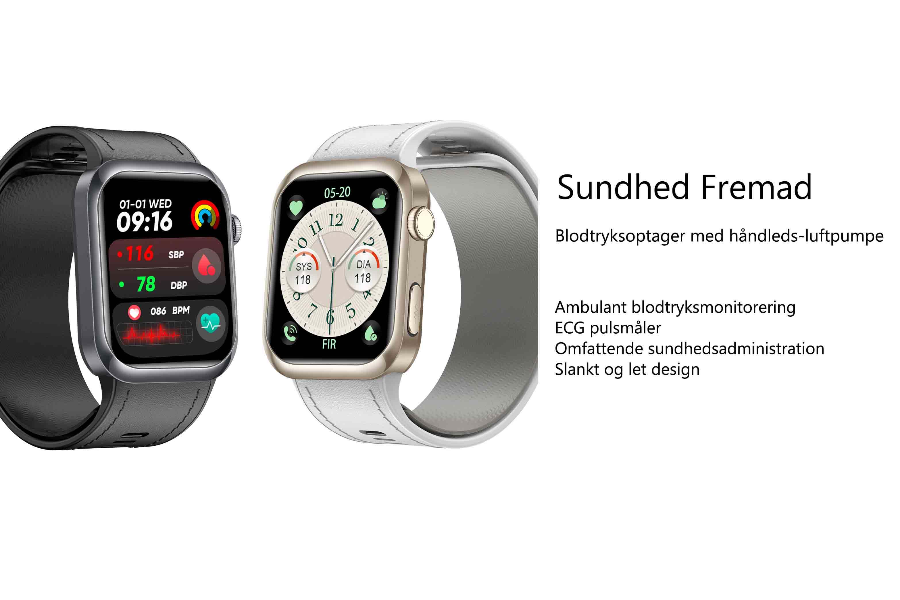 | Blodtryksovervågning | Understøttet, Oscillometrisk måling (luftpumpe + side-indsat rem airbag til præcis måling) |