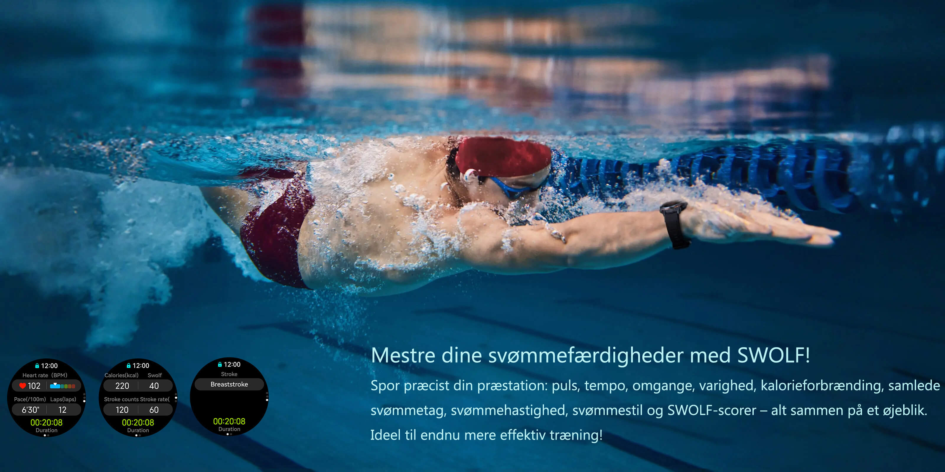 Svømmeregistrering Antal slag, svømmetakthastighed (SWOLF-anbefaling), svømstilsgenkendelse (crawl, brystsvømning, rygcrawl, butterfly)