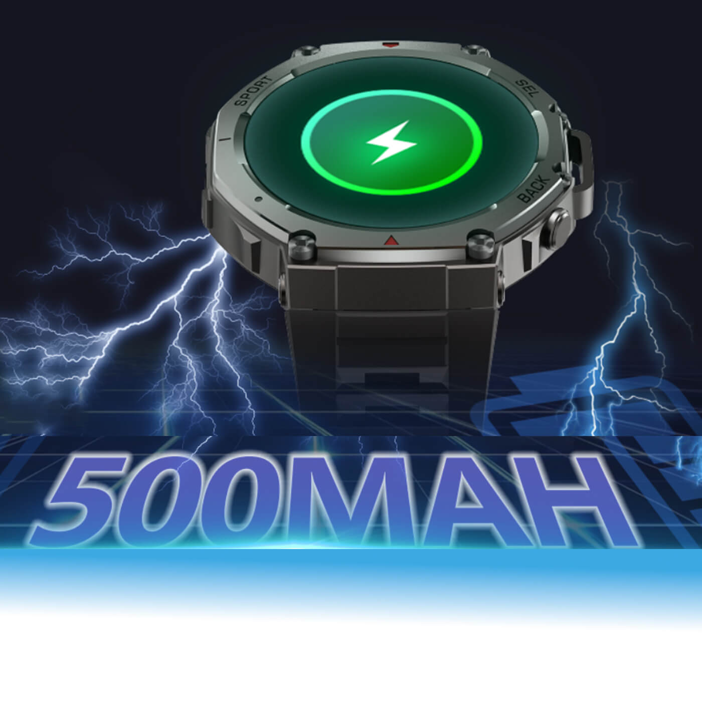 Med et 500mAh koboltbatteri holder det 12-15 dage ved normal brug, 5-8 dage ved intensiv brug og 3-5 dage med AOD (Always-On Display). I GPS-træningstilstand holder det 30-35 timer, perfekt til langdistanceaktiviteter eller udendørs eventyr.
