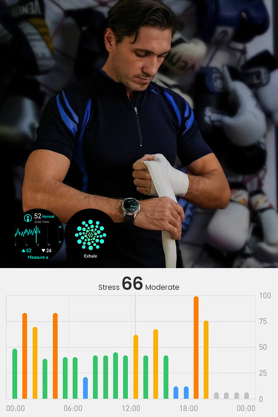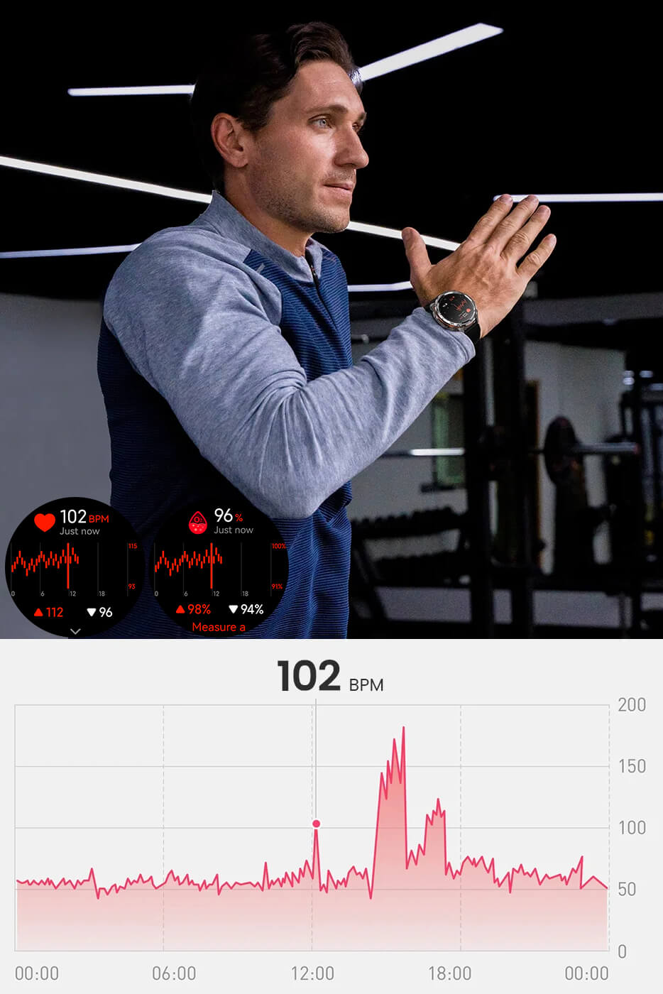 1,43-tommer berøringsskærm med høj opløsning, tre knapper til jævn navigation og udskiftelige silikoneremme til forskellige stilarter og behov. Let og ergonomisk til daglig brug og træning.